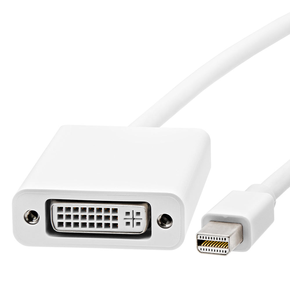 Mini DisplayPort to DVI Adapter - 6 Inches The white Mini DisplayPort to DVI-D Adapter from Cmple connects a mini DisplayPort device such as an Apple MacBook to an external DVI-D display or projector.From computers to HDTVs, this adapter allows you to stream your content at a Full HD resolution of 1920 x 1080 at 60 Hz. Use the Mini DisplayPort to DVI Adapter to connect an advanced digital monitor, such as the 20- or 23-inch Apple Cinema Display, that includes a DVI connector. Please check the documentation or check with the manufacturer of your monitor to make sure you're choosing the right adapter. Useful for connecting any DVI equipped display, including most HDTV's, projectors and digital monitors Premium Construction for Superior Signal Transfer The six-inch molded cable deliver reliable, error-free signal quality and protection from EMI/RFI interference.Molded nickel-plated connectors with gold-plated copper contacts ensure excellent conductivity.Integral strain relief and a rugged PVC jacket guarantee the cable and connectors last a long time. Features: Connector Type: Mini DisplayPort Male to DVI Female Supports computer video resolutions up to 1920 x 1200 Plug and play with no software or drivers to install Please check if your computer uses a Mini DisplayPort interface. Later generations of computers might use different adapters. Package Included: 6 Inches Mini DisplayPort to DVI Adapter