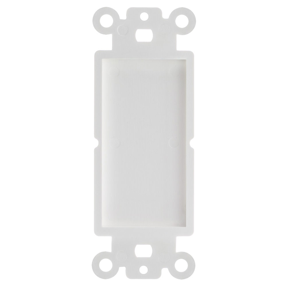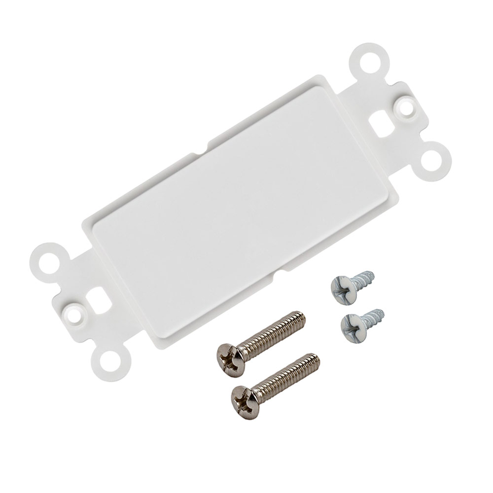Decora Type Blank Wall Plate Insert in WhiteThese integrated Cmple Decora inserts are made from durable plastic with a smooth glossy finish. They provide a great platformfor installing any ICC theater systems and are capable of holding all audio and video connectors.In certain instances where there are more gang ports than necessary, these particular inserts are better to use to cover the slots untilthere is a reason to substitute them. Customize your wall plate with these inserts for the appropriate purposes, and you will createan organized and professional aesthetic that reflects well onto others.Specifications & Features:Mounting strap for blank insertFills unused ports allowing for future upgradesDurable ConstructionEasy to Use, Install and CleanChanges a standard decorator opening to blankFor box mounted applicationsMounting screws includedColor: WhiteCmple Blank Décor Insert is necessary for a professional and finished looking installation and customized applications.If there are any outlets intended for future use the Blank Wall Plate can keep it covered with a sleek high impact-resistantpersonalized plate. Use to cover unused holes and remove when ready for expansion. This insert is compatible withDecora Wall Plates and can easily be removed when the time come to replace the insert with a new personalized insert.