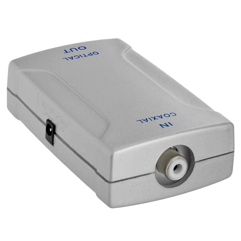 Coaxial RCA Jack(Input) Digital Audio to Optical Toslink Jack(Output) Converter Digital Audio Signal Converter device converts Coaxial RCA Plug (IN) to Optical TosLink Plug (OUT). This converter will transform your digital RCA Coaxial (S/PDIF) audio signal to a Digital Toslink Optical signal. It will allow you to connect the coaxial digital audio output from your DVD, cable or satellite receiver to a Toslink digital optical input. The compact size of this unit lets you place it almost anywhere. Installation of this device is simplified to the maximum - just plug in your two cables, plug in the power supply and you are good to go! Please note that this device does not convert analog mono RCA to digital TosLink. Used for Digital Signal ONLY Dimensions: 2 13/16inch x 1 7/8inch Input: Coaxial RCA Jack Output: Optical TosLink Jack Comes with power adapter Comes with a dust cap on Optical TosLink end Dust cap on optical end must be removed before use (Pull Out) Color: Silver With Blue writings Input 120V AC 60Hz Output: 6VDC 500mA