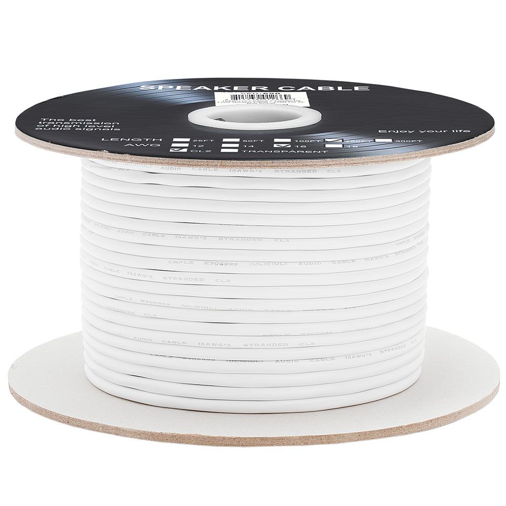 Cmple - 16 Gauge 2 Conductor CCA Speaker Wire Cable - White This 16 AWG and CL2 rated speaker wire is an ideal choice for connecting your loud speakers to an AV receiver or amplifier in a 2.1, 5.1, or 7.1 channel home theater system. CCA wire offers the same signal frequency and reliability in terms of corrosion resistance to copper wire. The advantage of the CCA speaker wire is lighter and more flexible than copper wire. The cost of CCA vs Oxygen free copper is much lower and you can enjoy the same functions and reliability as copper wire without paying the extra cost for the installation. The cable is made of CCA Copper Clad Aluminum, ensuring high fidelity sound quality and providing maximum's conductivity and durability without paying the additional cost. The product go through many states of testing to ensure the highest performance and reliability of the products. Our Cmple speaker cable has durable PVC jacket which complies with the CL2 rating for the fire safety requirements. Two conductors are jacketed with color-coded PVC for easy polarity identification In-Wall Speaker Cable 16 AWG 2C In Wall Cable is optimized for use in a wide range of applications, including LED lighting installations such as white or single color LED strip light installations, LED tape light installations, CB radios, stereo/sound equipment and other low-voltage appliances. Made using premium quality materials and CL2 rated, flame resistant PVC. Highest Quality Material The cable is made of CCA Copper Clad Aluminum, ensuring high fidelity sound quality and providing maximum's conductivity and durability without paying the additional cost. In-wall rated The CL2 rating indicates that the cable complies with fire safety and insurance requirements making it safe for use inside the walls of residential class buildings. For flexible custom installation options. PVC jacket material Protects the interior cable and components from dust, moisture and breakages Easy Installation Wire your home easily with this speaker 16/2 wire. Its two CCA wires are covered with a specially designed finish, so it moves inside a wall with little resistance. The spiral geometry of this Cmple Audio cable minimizes sound going out of focus for more enhanced listening. High quality undistorted sound for your equipment Cable quality can have a huge impact on your speaker setup. Poor quality cable means poor quality sound. This 18 AWG speaker wire features CCA conductors, which means you get great sound quality for a great cost. Wide Compatibility Fits banana plugs, spade tips or bent pin connectors, which are typically compatible with audio components like speakers, A/V receivers, amplifiers and other professional sound applications Installation Intended for custom installs. Features and Specifications: Conductor count: 2 Gauge: 16AWG CL2 Rated Conduit: Copper-clad aluminum (CCA) Flexible and insulated PVC jacket Perfect for home theatre, car, RV and audio systems High quality undistorted sound for your equipment Outer Jacket Color: White Length: 250FT These cables are capable of delivering loud, clear and crisp audio reproduction limited only by the quality of the equipment you are using.