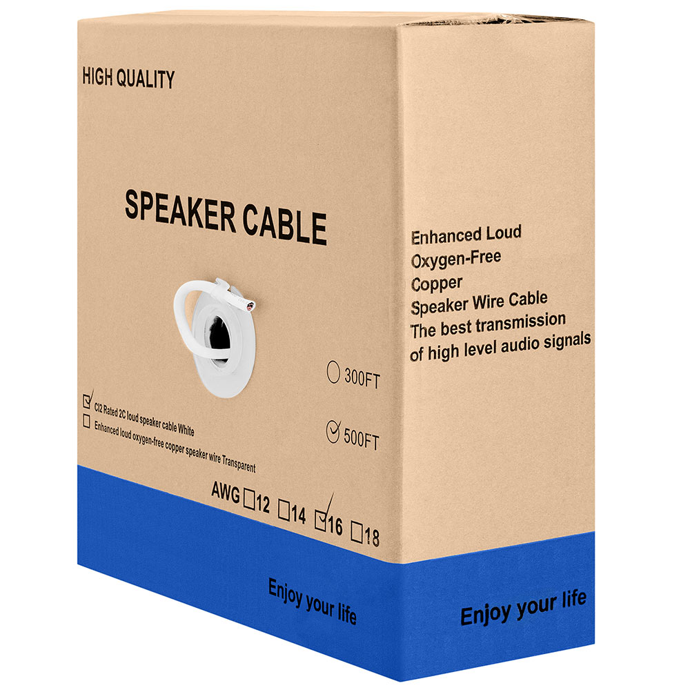 Cmple - 16 Gauge 2 Conductor CCA Speaker Wire Cable - White This 16 AWG and CL2 rated speaker wire is an ideal choice for connecting your loud speakers to an AV receiver or amplifier in a 2.1, 5.1, or 7.1 channel home theater system. CCA wire offers the same signal frequency and reliability in terms of corrosion resistance to copper wire. The advantage of the CCA speaker wire is lighter and more flexible than copper wire. The cost of CCA vs Oxygen free copper is much lower and you can enjoy the same functions and reliability as copper wire without paying the extra cost for the installation. The cable is made of CCA Copper Clad Aluminum, ensuring high fidelity sound quality and providing maximum's conductivity and durability without paying the additional cost. The product go through many states of testing to ensure the highest performance and reliability of the products. Our Cmple speaker cable has durable PVC jacket which complies with the CL2 rating for the fire safety requirements. Two conductors are jacketed with color-coded PVC for easy polarity identification In-Wall Speaker Cable 16 AWG 2C In Wall Cable is optimized for use in a wide range of applications, including LED lighting installations such as white or single color LED strip light installations, LED tape light installations, CB radios, stereo/sound equipment and other low-voltage appliances. Made using premium quality materials and CL2 rated, flame resistant PVC. Highest Quality Material The cable is made of CCA Copper Clad Aluminum, ensuring high fidelity sound quality and providing maximum's conductivity and durability without paying the additional cost. In-wall rated The CL2 rating indicates that the cable complies with fire safety and insurance requirements making it safe for use inside the walls of residential class buildings. For flexible custom installation options. PVC jacket material Protects the interior cable and components from dust, moisture and breakages Easy Installation Wire your home easily with this speaker 16/2 wire. Its two CCA wires are covered with a specially designed finish, so it moves inside a wall with little resistance. The spiral geometry of this Cmple Audio cable minimizes sound going out of focus for more enhanced listening. High quality undistorted sound for your equipment Cable quality can have a huge impact on your speaker setup. Poor quality cable means poor quality sound. This 18 AWG speaker wire features CCA conductors, which means you get great sound quality for a great cost. Wide Compatibility Fits banana plugs, spade tips or bent pin connectors, which are typically compatible with audio components like speakers, A/V receivers, amplifiers and other professional sound applications Installation Intended for custom installs. Features and Specifications: Conductor count: 2 Gauge: 16AWG CL2 Rated Conduit: Copper-clad aluminum (CCA) Flexible and insulated PVC jacket Perfect for home theatre, car, RV and audio systems High quality undistorted sound for your equipment Outer Jacket Color: White Length: 500FT These cables are capable of delivering loud, clear and crisp audio reproduction limited only by the quality of the equipment you are using.