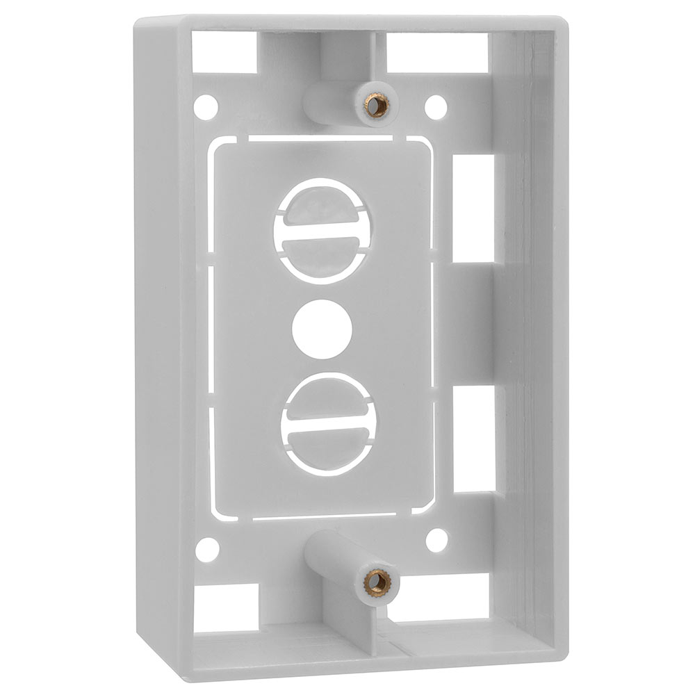 Surface Mount Junction Box for single-gang Wall plates Features: Suitable for Single-Gang Telephone and Data Wall Plates High Impact ABS Plastic Threaded Brass Inserts for Plate Mounting Screws Dimensions: 2 3/4inch(W) x 4 1/2inch(H) x 1 7/8inch(D) Color: White