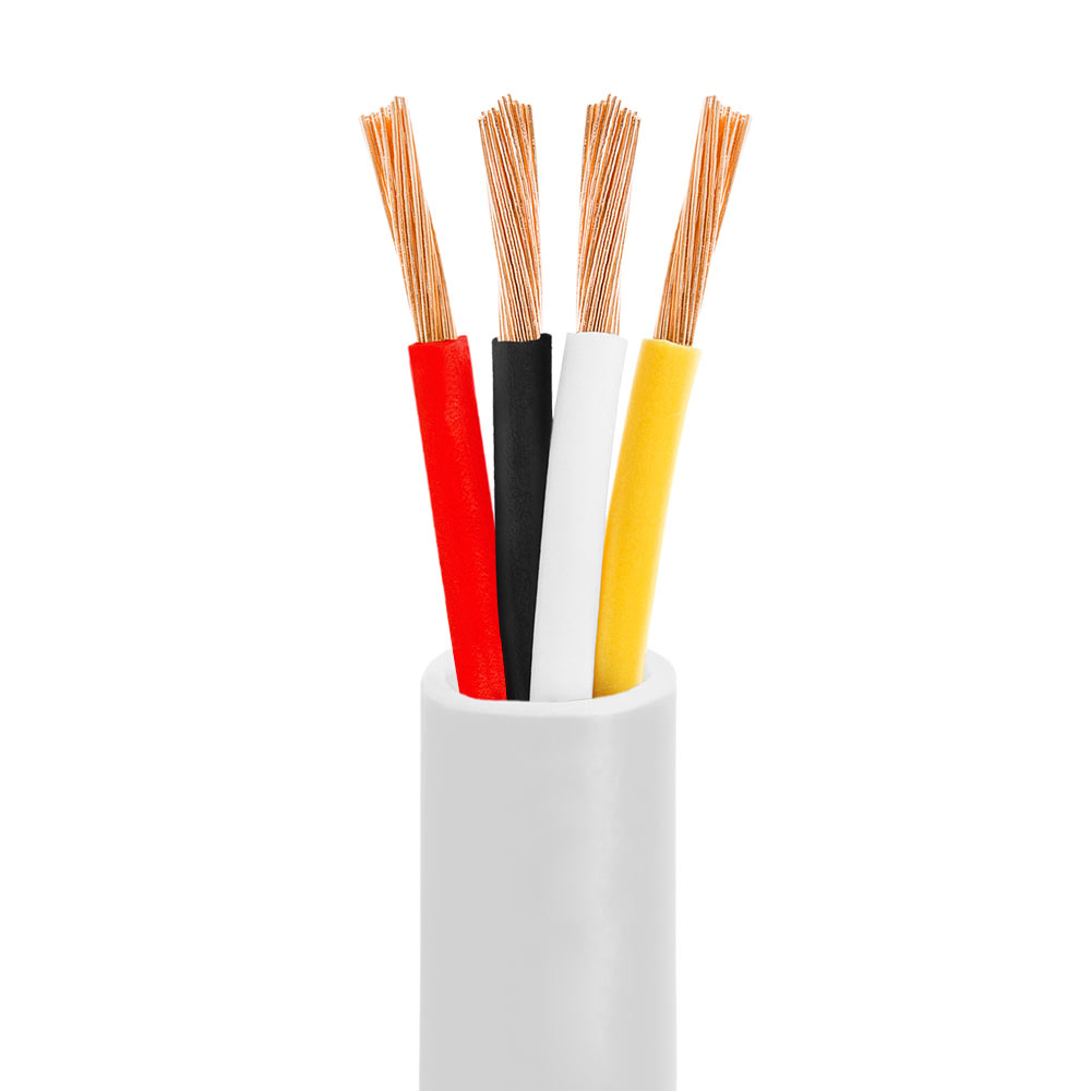 Cmple - 14 Gauge 4 Conductor CCA Speaker Wire Cable - White This 14 AWG and CL2 rated speaker wire is an ideal choice for connecting your loud speakers to an AV receiver or amplifier in a 2.1, 5.1, or 7.1 channel home theater system. CCA wire offers the same signal frequency and reliability in terms of corrosion resistance to copper wire. The advantage of the CCA speaker wire is lighter and more flexible than copper wire. The cost of CCA vs Oxygen free copper is much lower and you can enjoy the same functions and reliability as copper wire without paying the extra cost for the installation. The cable is made of CCA Copper Clad Aluminum, ensuring high fidelity sound quality and providing maximum's conductivity and durability without paying the additional cost. The product go through many states of testing to ensure the highest performance and reliability of the products. Our Cmple speaker cable has durable PVC jacket which complies with the CL2 rating for the fire safety requirements. Four conductors are jacketed with color-coded PVC for easy polarity identification In-Wall Speaker Cable 14 AWG 4C In Wall Cable is optimized for use in a wide range of applications, including LED lighting installations such as white or single color LED strip light installations, LED tape light installations, CB radios, stereo/sound equipment and other low-voltage appliances. Made using premium quality materials and CL2 rated, flame resistant PVC. Highest Quality Material The cable is made of CCA Copper Clad Aluminum, ensuring high fidelity sound quality and providing maximum's conductivity and durability without paying the additional cost. In-wall rated The CL2 rating indicates that the cable complies with fire safety and insurance requirements making it safe for use inside the walls of residential class buildings. For flexible custom installation options. PVC jacket material Protects the interior cable and components from dust, moisture and breakages Easy Installation Wire your home easily with this speaker 14/4 wire. Its four CCA wires are covered with a specially designed finish, so it moves inside a wall with little resistance. The spiral geometry of this Cmple Audio cable minimizes sound going out of focus for more enhanced listening. High quality undistorted sound for your equipment Cable quality can have a huge impact on your speaker setup. Poor quality cable means poor quality sound. This 14 AWG speaker wire features CCA conductors, which means you get great sound quality for a great cost. Wide Compatibility Fits banana plugs, spade tips or bent pin connectors, which are typically compatible with audio components like speakers, A/V receivers, amplifiers and other professional sound applications Installation Intended for custom installs. Features and Specifications: Conductor count: 4 Gauge: 14AWG CL2 Rated Conduit: Copper-clad aluminum (CCA) Flexible and insulated PVC jacket Perfect for home theatre, car, RV and audio systems High quality undistorted sound for your equipment Outer Jacket Color: White Length: 100FT These cables are capable of delivering loud, clear and crisp audio reproduction limited only by the quality of the equipment you are using.
